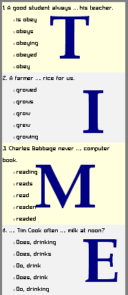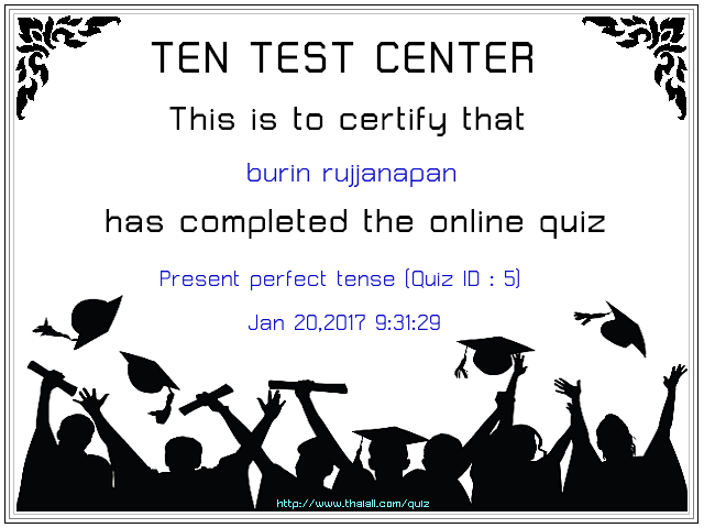 Past tense quiz ข้อสอบออนไลน์ แบบเลือกตอบ แจ้งคะแนนสอบ แต่ไม่เฉลย ส่งเสริมให้ค้นคว้าด้วยตนเอง และฝึกทำได้หลายครั้ง เมื่อทำเสร็จจะบันทึกคะแนนแต่ละรอบเข้า 100 รายการล่าสุด มีใบรับรอง (Certificate) แบบออนไลน์แชร์ไป Social Media เพื่อเป็นขวัญกำลังใจให้กับผู้ที่มีความมุ่งมั่น